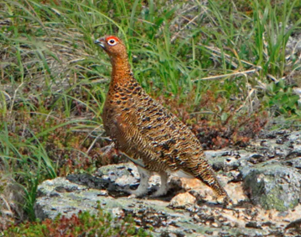 Den har en rund kroppsform med lång hals, litet huvud och en kort, grov och mörk näbb. Den har fjäderklädda tarser och tår och en kort stjärt som den spärrar ut i flykten. Om våren (maj/juni) har den adulta hanen en mättat mörkt rödbrun fjäderdräkt på övre delen av bröstet, halsen och huvudet med en stor röd kam ovanför varje öga. För övrigt är ovansidan vit med inslag av rödbruna fjädrar. Undersidan är vit och stjärten svart. På sensommaren (augusti/september) har den adulta hanen ruggat så att mer av bröstet och hela ovansidan är grå-gulbrun.