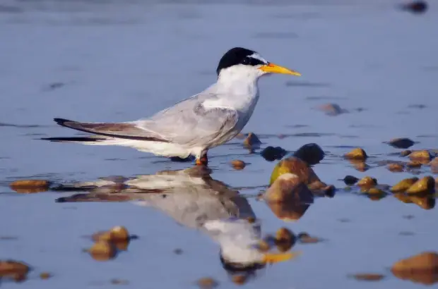 Mellan den svarta hjässan och ögonmasken finns en smal vit kil i pannan. Lätena är skarpt och orent: "kr'rit". De blir flygfärdiga efter tre veckor, men fortsätter att bli matade av föräldrarna en vecka till, tills de själva kan fiska genom att göra störtdykningar. Småtärnan söker föda vid kusten, men även i långsamt flytande floder. Den här artikeln är helt eller delvis baserad på material från engelskspråkiga Wikipedia, Little tern, 21 augusti 2005. ISBN 91-1-913142-9 Artportalen: Dagens fynd – senaste observationerna – bilder Dansk ornitologisk forening Wikispecies har information om småtärna. Wikimedia Commons har media som rör småtärna.