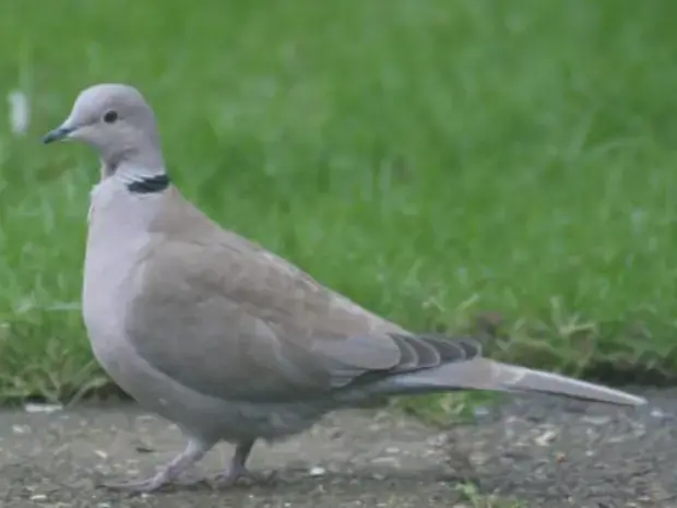Arten är långsträckt och ljust beigegrå med vit kant på stjärten och ett karakteristiskt svart band i nacken.